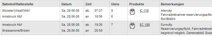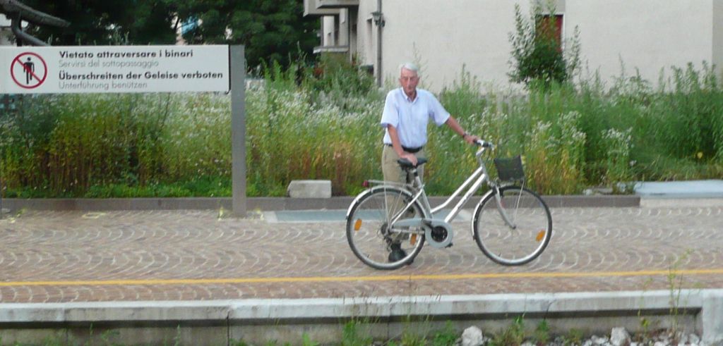Dann kommt doch ein wenig Unruhe auf: Franz hat das Netzteil des Rechners bei der Hektik zuhause vergessen - Ulla musste ihm auch schon mit dem Auto die Tabletten nachbringen. Kurz hinter Bregenz im Zug: Ein Alpenüberquerer stellt sein recht teures Mountain-Bike (evtl. 3000,- €) in unser Abteil und geht wieder raus; aber der Zug fährt ohne ihn ab. Mit einer riskanten Fahrt in seinem PKW steht er 2 Stationen weiter wieder im Abteil. Der Zugführer: "Eigentlich kann man die Bahn hier gar nicht einholen". Der Biker hatte gedacht, der Zug würde erst losfahren, wenn er bei seinem Gepäck wäre. Dies hatte er zwei Waggons vorher samt Fahrrad rein gestellt. Der Zugführer hatte ihn jedoch das Fahrrad wieder raus tragen lassen mit dem Hinweis "Räder gehören in das Radabteil am Zugende". Dort waren wir und unsere Letzemänner. Dann nach schier endlosen Stunden Zugfahrt (mit Bier, Eis, Butterbrezeln und Salamettis) in Brixen: Jürgen!!