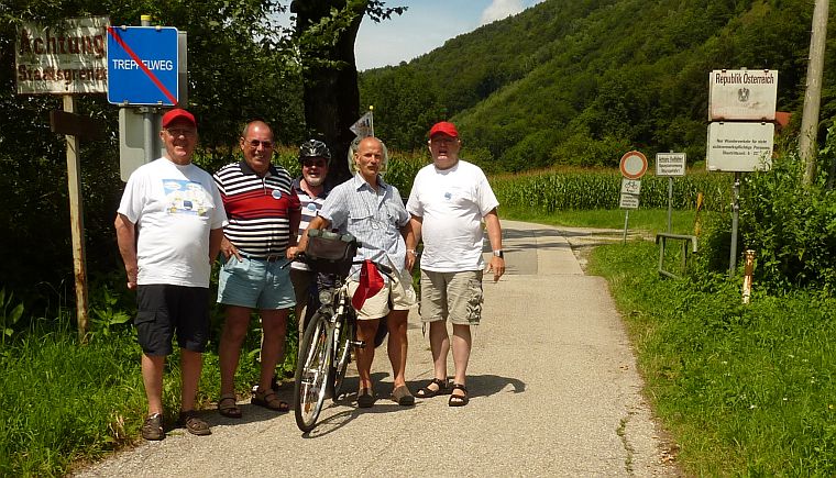 Grenzübergang aus beiden Richtungen. Klaus verdeckt mit seinem Kopf genau das Emblem des Freistaates Bayern.