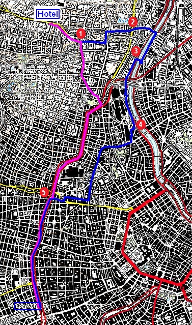 Wir fahren im Dunkeln runter Richtung Westbahnhof. Die Entfernung beträgt etwa 6,49 km (violett gezeichnet). Das bedeutet - rote Ampeln eingeschlossen - eine Fahrzeit von etwa 40 Minuten. Die Reserve sind hochgerechnet etwa: 25 Minuten |