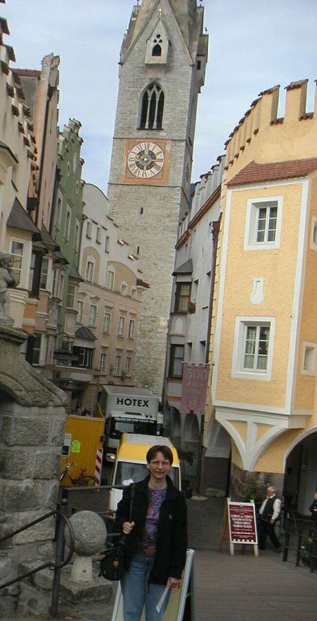Ulla vor dem weißen Turm, dem Wahrzeichen von Brixen