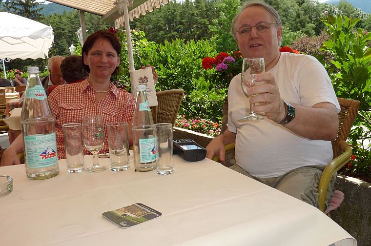 des Pustertalradweges (kurz vor Kienz) Erneut etwa 1,5 Liter Flüssigkeit auf der Terrasse des Hotels zur Post in Kiens (kurz vor der Steigung - über die Brücke)