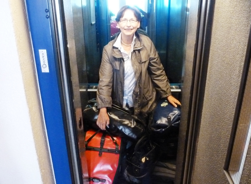 Abschied von Freiburg - Ulla  im Aufzug mit Gepäck zugepflastert ... unten Bahnhof