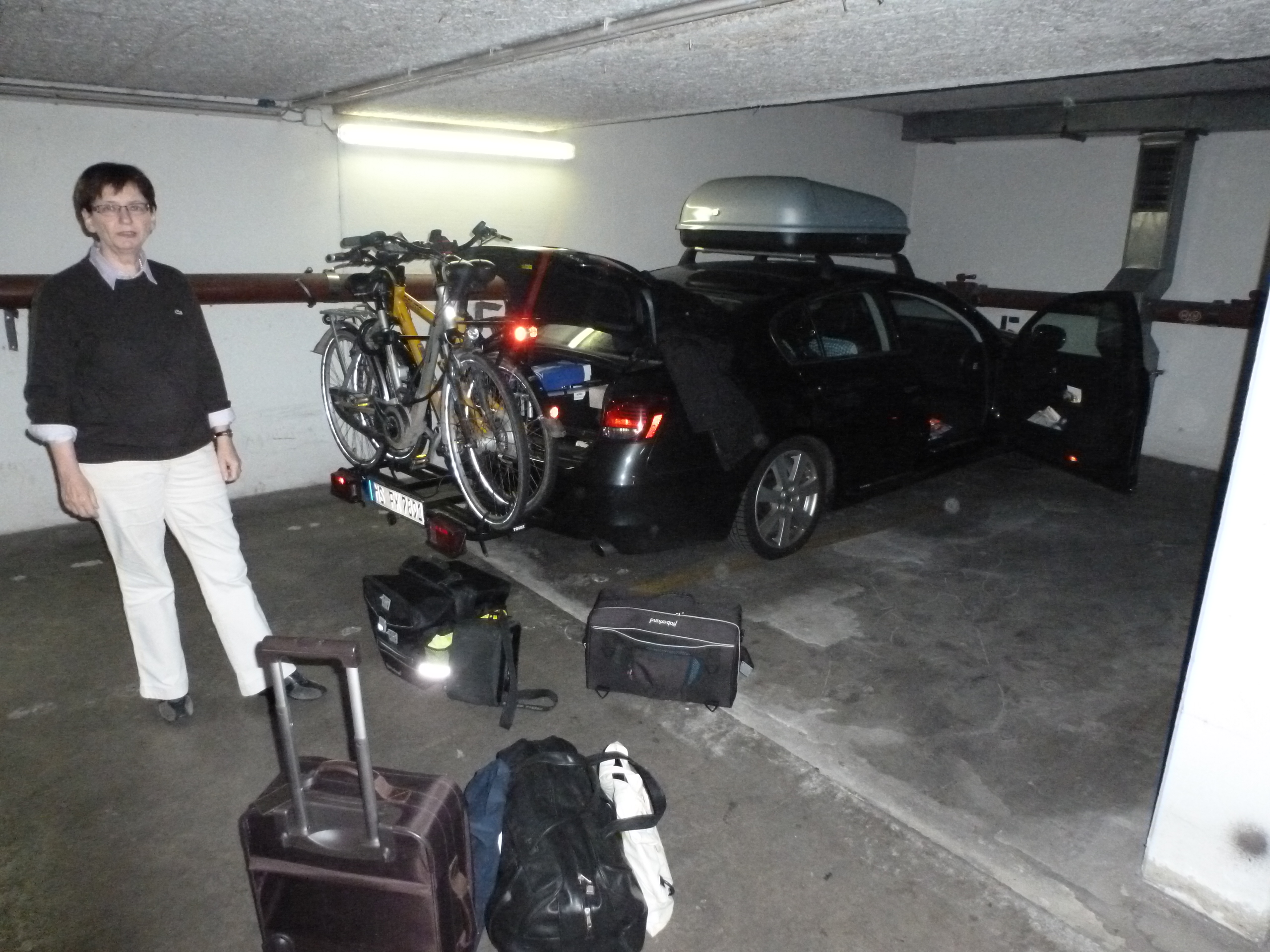 Umpacken vom Auto auf die Räder für die große Tour im Garagenkeller vom Hotel Alexander |