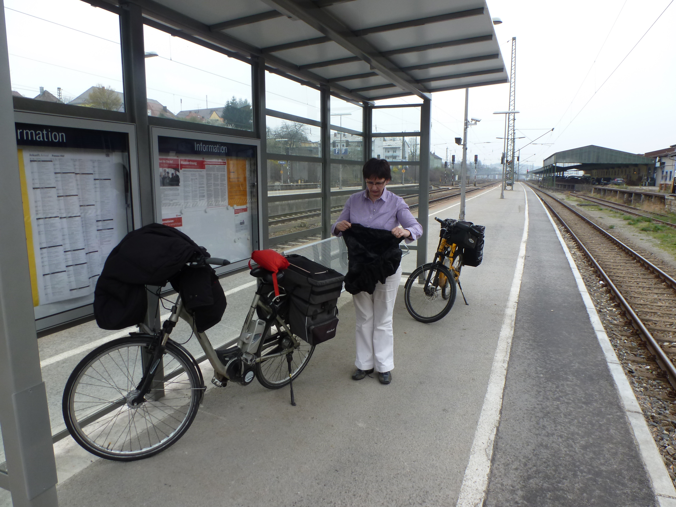 den Autospuren verläuft. Im Westbahnhof kauft Franz Fahrkarten für den Zug nach Passau - unsere Bahncard 'gildet' hier nicht. Die Bahnhöfe von Wien und Wels sind im Gegensatz zu denen von Münster und Passau echt fahrradfreundlich: Es gibt sehr schöne Aufzüge. |