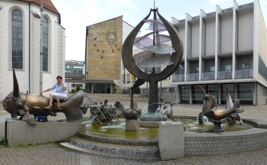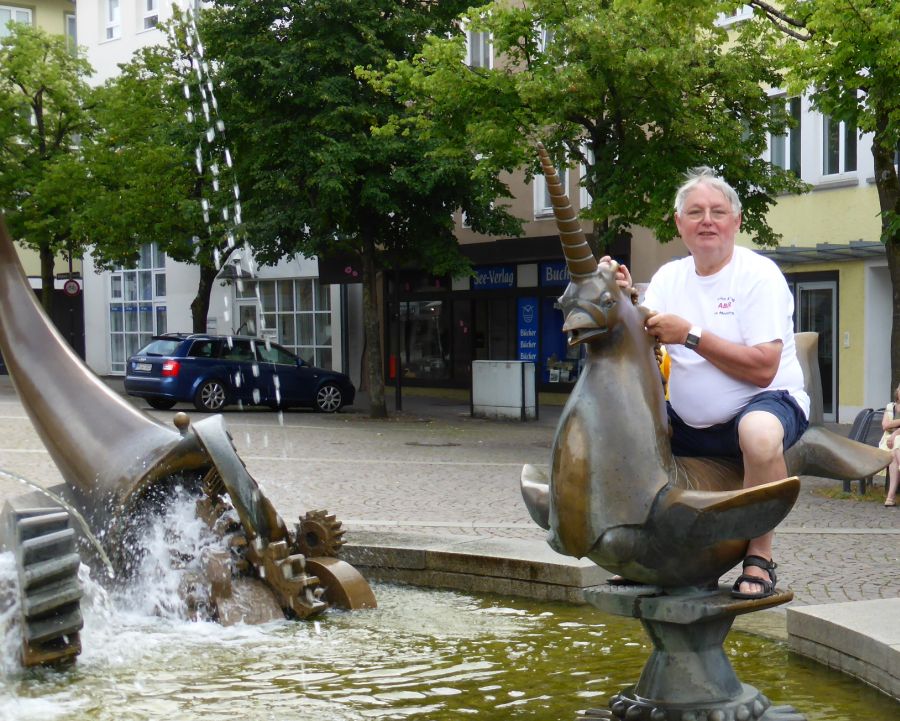 | Ulla rittlings auf dem gehörnten Luftschiff - Franz reitet ein Bronze- Einhorn. | |||
