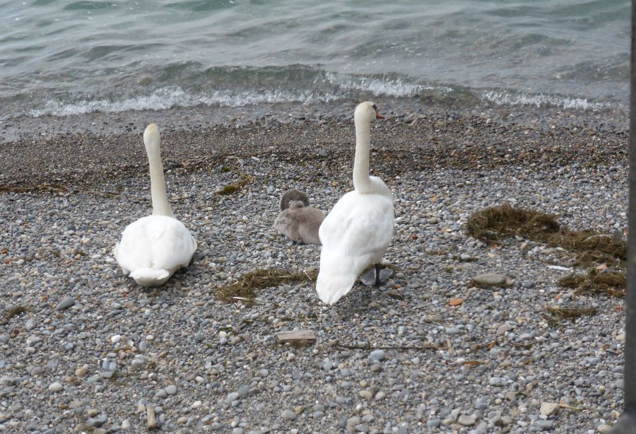 Kurzer "Frühschoppen" beim Griechen (Delphi) vor dem drohenden Gewitter: Tische wurden abgeräumt - Schirme zusammengelegt - aber es kam nichts. Auch unsere Stammschwäne mit Jungem ließen sich nichts anmerken: |