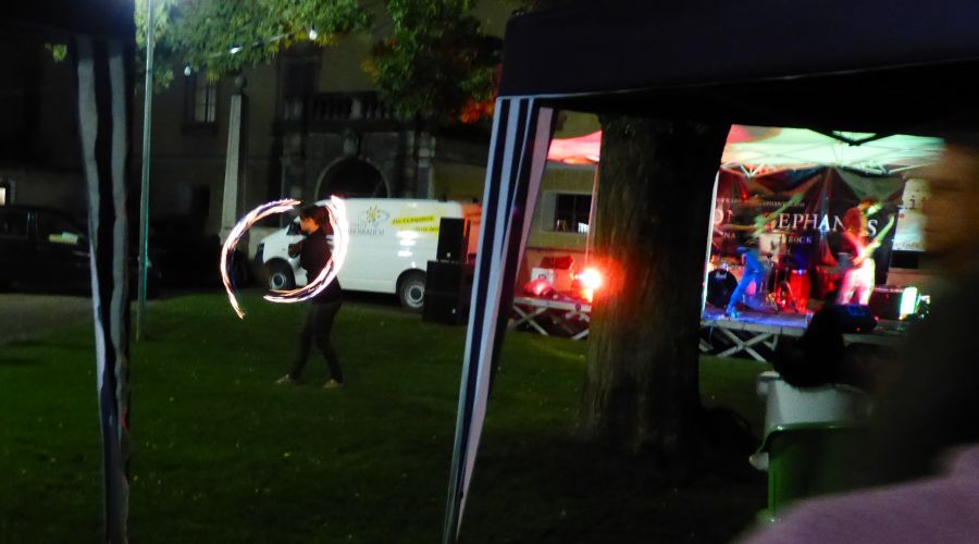 | Nach dem Essen: Rockkonzert mit Fackeltänzerin neben dem Kutscherhof .... | ||