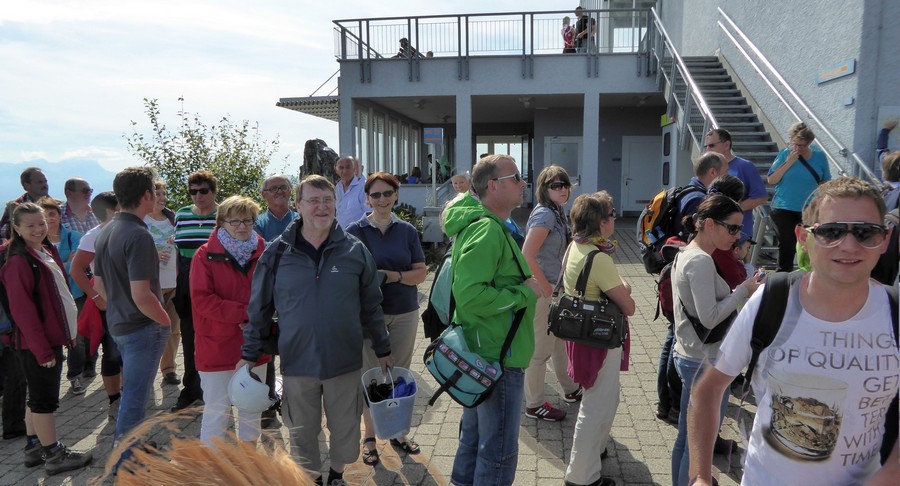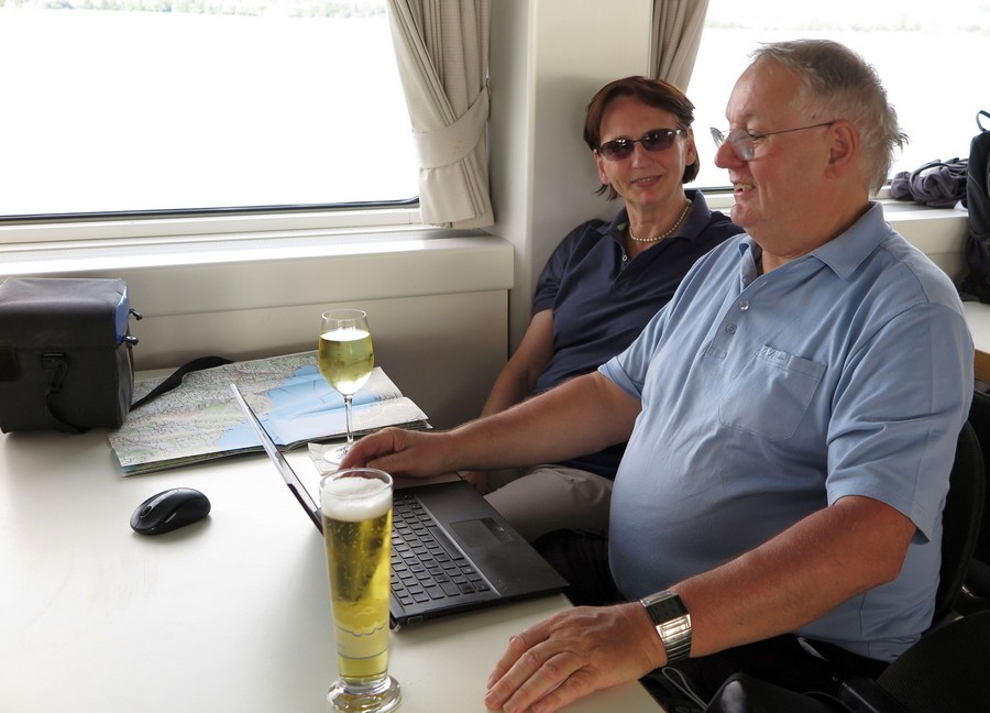 "Unser Zeppelin" wirkt von oben recht klein. Die Schlange vor der Talfahrt der Pfänderbahn war so lang, dass Rolf und Renate zu Fuß nach unten wollten "Wer drängelt, hat mehr vom Leben" und so sehen Drängler aus. Wer Natürlich kamen sie eine Gondel eher nach unten als wir. --- Rückfahrt mit dem Schiff. |