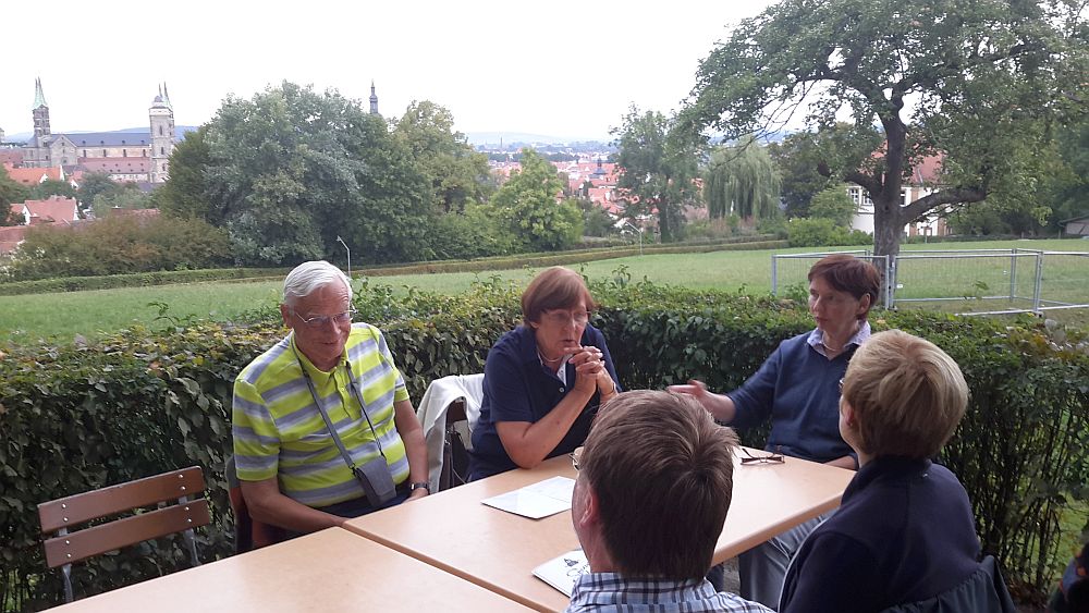 erkennen, obwohl uns das NAVI bis vor die Tür geführt hatte. ---- Dann ging es hinauf auf den Spezialkeller mit schöner Sicht über Bamberg, wo Anne und Harald schon warten. |