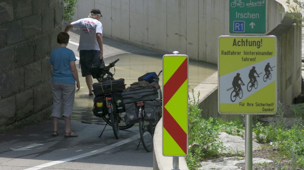 unter der Eisenbahnbrücke, wo der Radweg schon mal überflutet war,