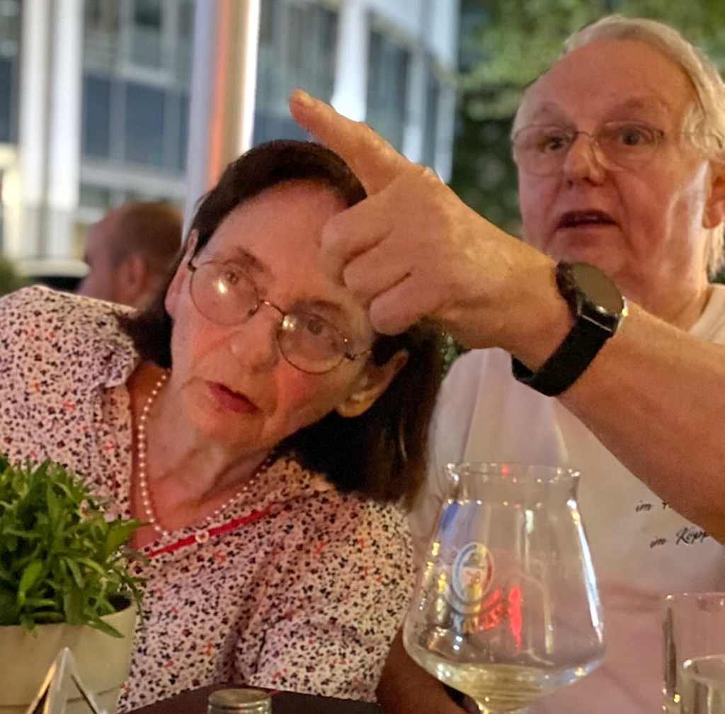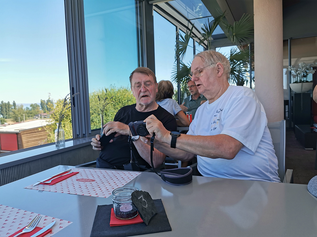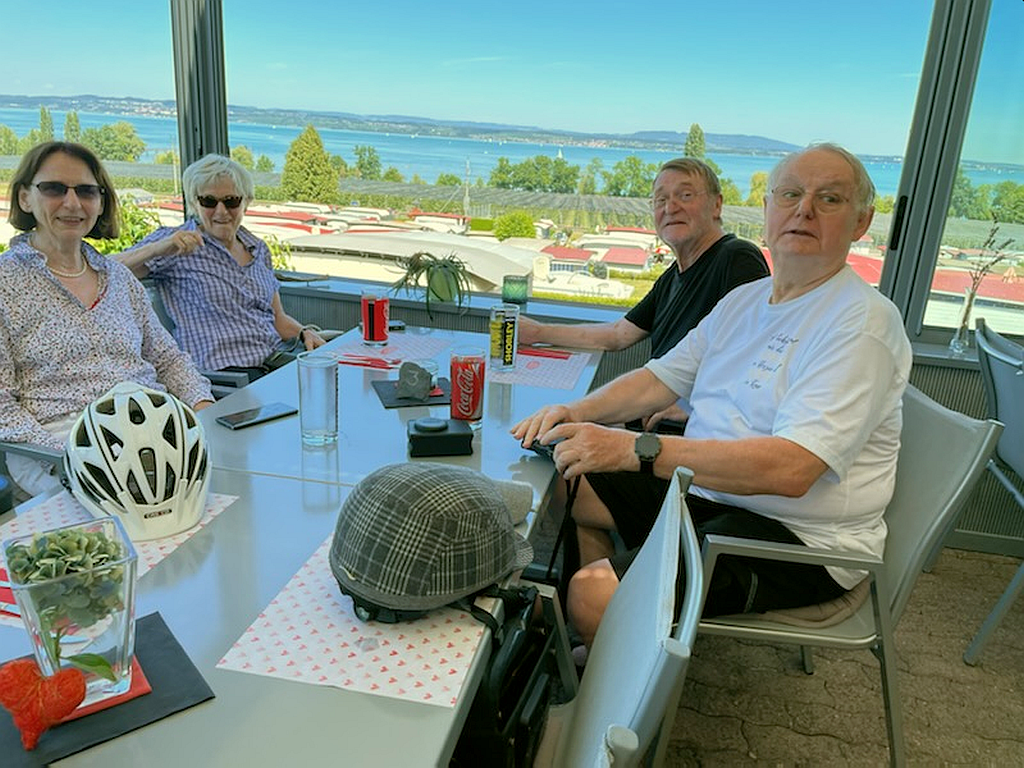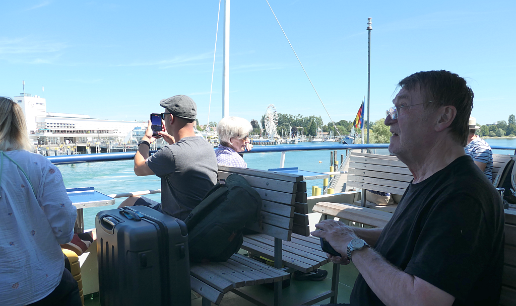 Auf der Fähre: Renate und Rolf werfen einen Blick zurück (Zeppelinmuseum)