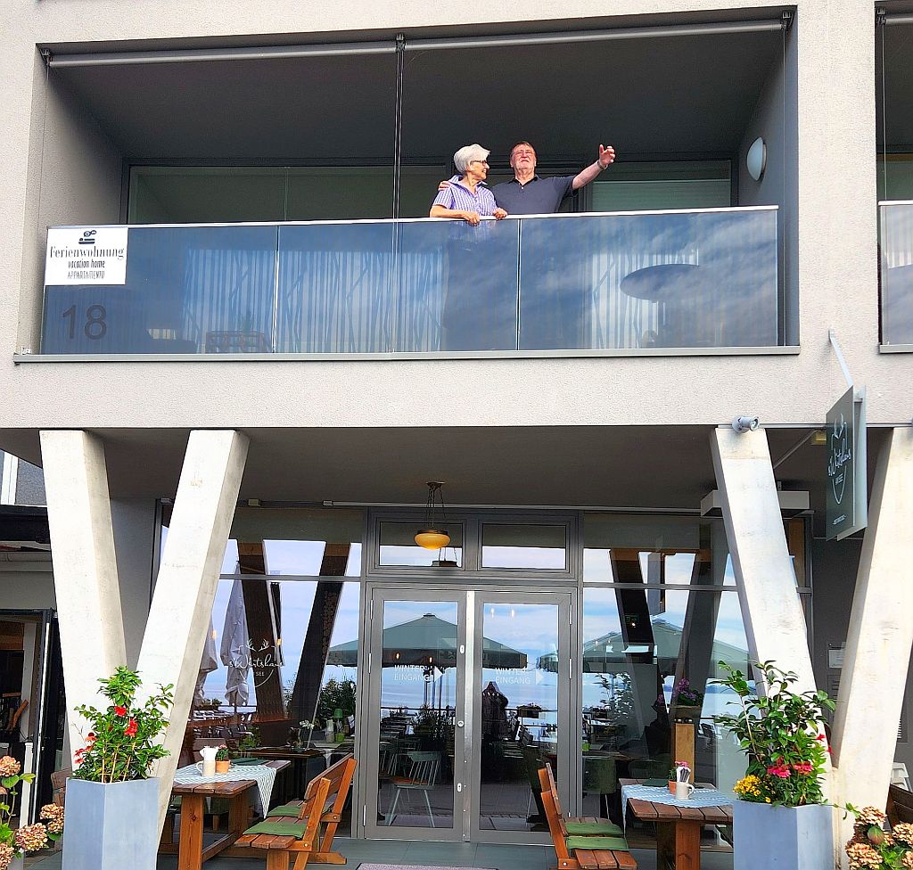 Die Herrschaften schauen vom Balkon ihrer Ferienwohnung.